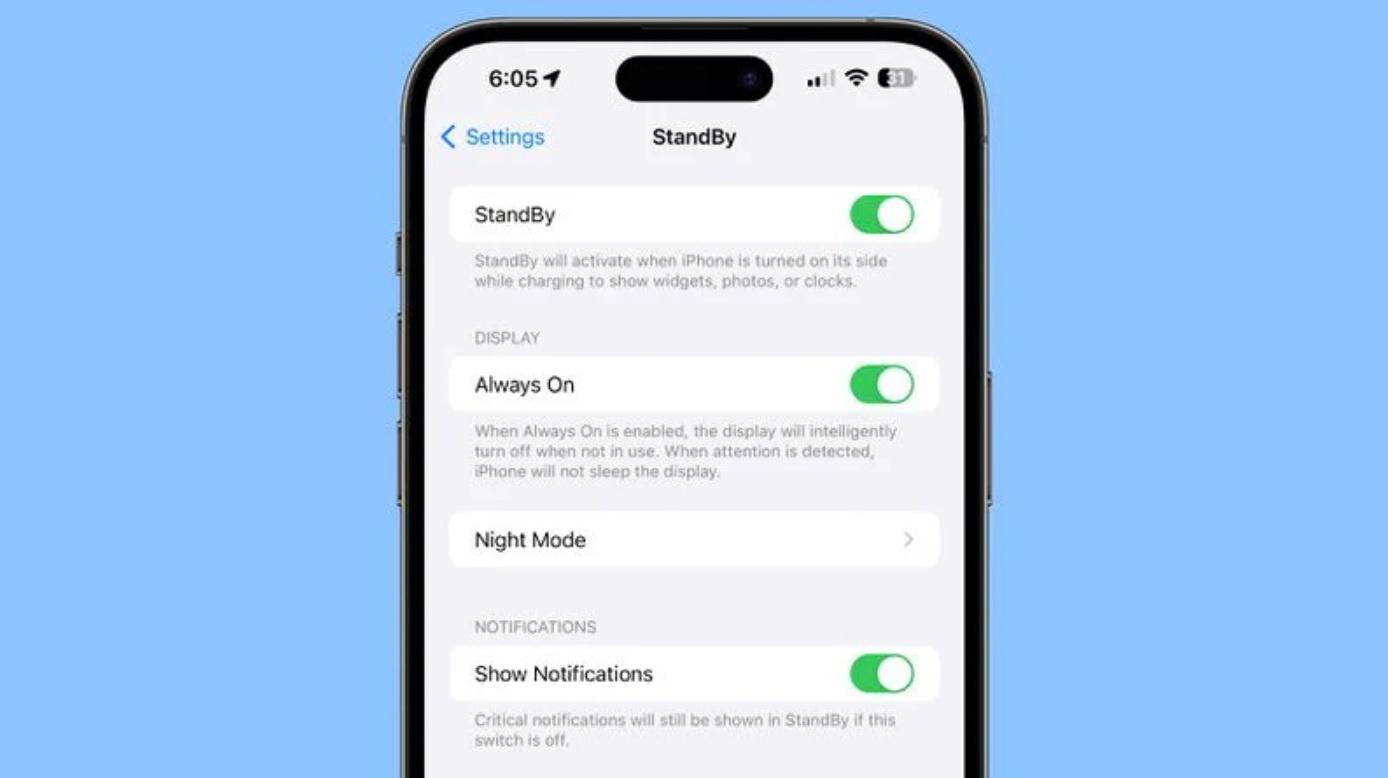 iPhone 14 Pro และ iPhone 14 Pro Max (และ iPhone ในอนาคต) StandBy มีประโยชน์มากขึ้นเนื่องจากการแสดงผลตลอดเวลา (always-on display) StandBy จะแสดงเนื้อหาตลอดเวลาและใช้งานได้บนอุปกรณ์เหล่านี้โดยไม่ต้องโต้ตอบกับ iPhone