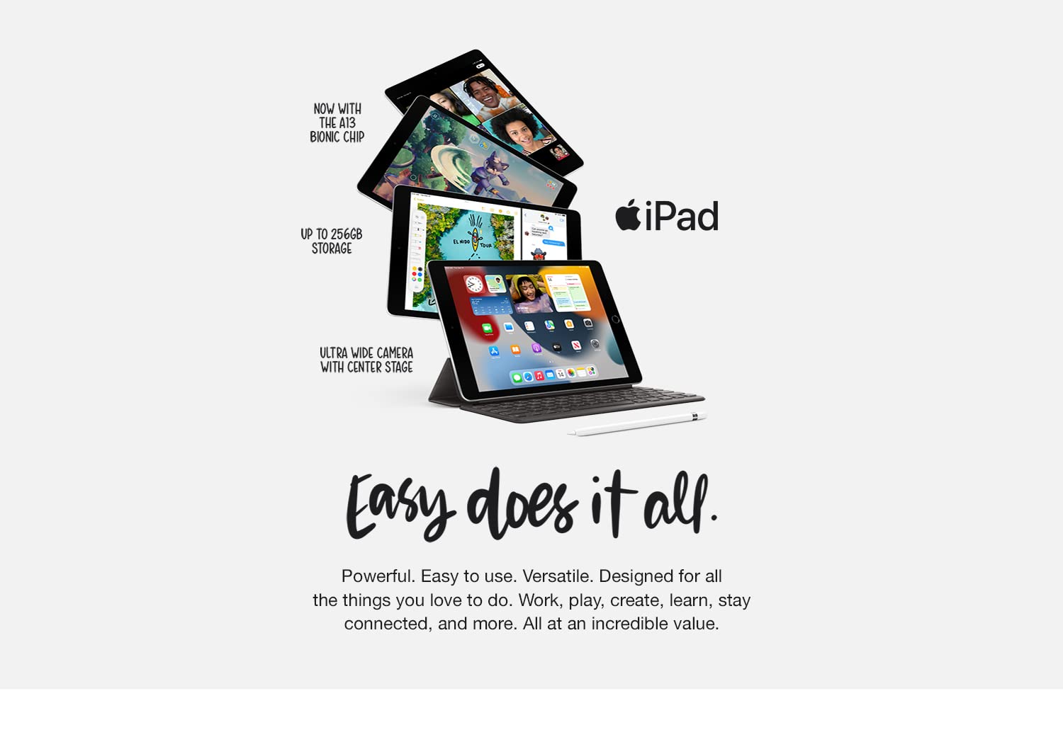 iPad รุ่นที่ 9 ทำงานด้วยชิป A13 Bionic ของ Apple ซึ่งเป็นชิปเดียวกันกับ iPhone 11 ซีรี่ส์ปี 2019 มันอาจจะไม่มีความคล่องตัวเท่า M1 แต่มันก็พอเร็วสำหรับงานทั่วไป ในเรื่องของอุปกรณ์เสริมในระบบแบบเดียวกับ Apple Smart Keyboard และปากกาสไตลัสรุ่นเก่า อย่างไรก็ตาม มันยังคงมีประโยชน์อยู่