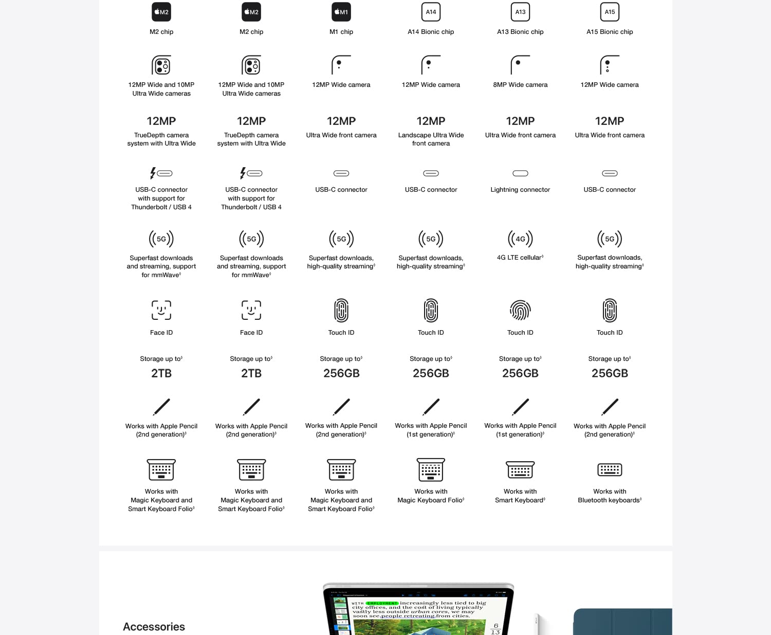 นอกจากนี้ Pro ยังมีพอร์ต USB-C แบบ Thunderbolt ที่เร็วกว่า ลำโพงที่ยอดเยี่ยมกว่า และรองรับ Face ID ด้วย ด้วยการอัปเกรดล่าสุด Pro สามารถรู้จักเมื่อปากกา Apple อยู่เหนือหน้าจอและแสดงตัวอย่างของการป้อนข้อมูล มีตัวเลือกการเก็บข้อมูลเพิ่มเติม สูงสุดถึง 2TB โดยรุ่น 1TB และ 2TB ทำให้จำนวน RAM เพิ่มขึ้นจาก 8GB เป็น 16GB (ในราคาที่สูงมาก) และมันใช้งานได้กับอุปกรณ์เสริมที่ดีที่สุดของ Apple ทั้งหมด